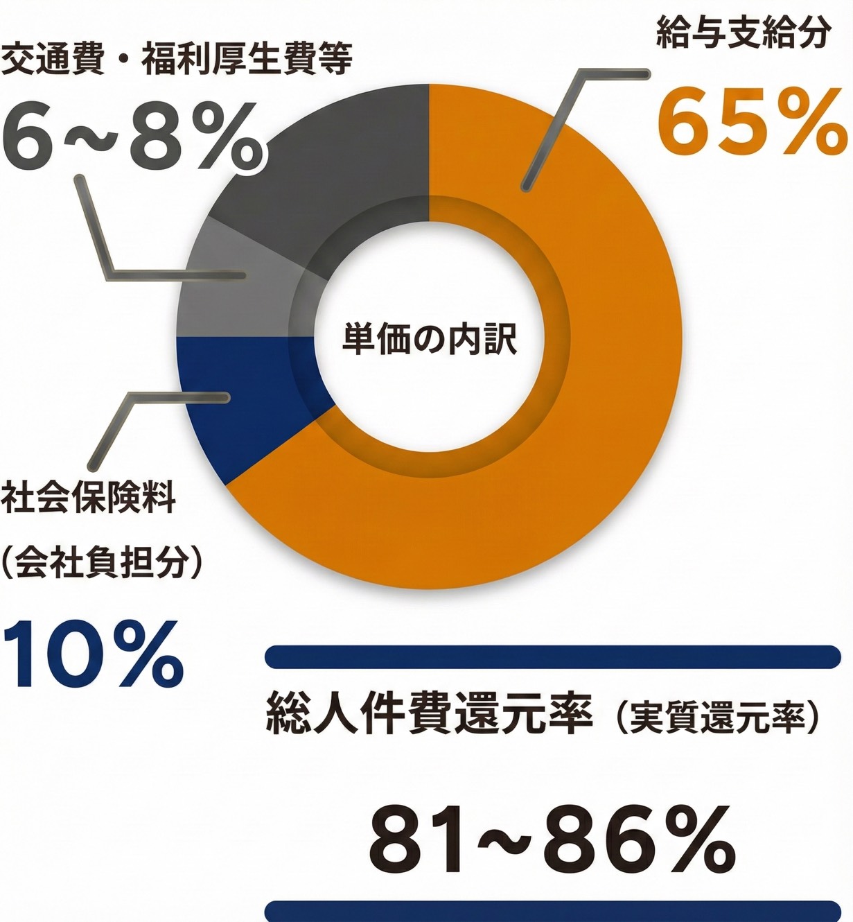 給与(65%)に加え、会社負担の社会保険料(約10%)や交通費、福利厚生費などを含めると、単価の81%〜86%の還元率となります